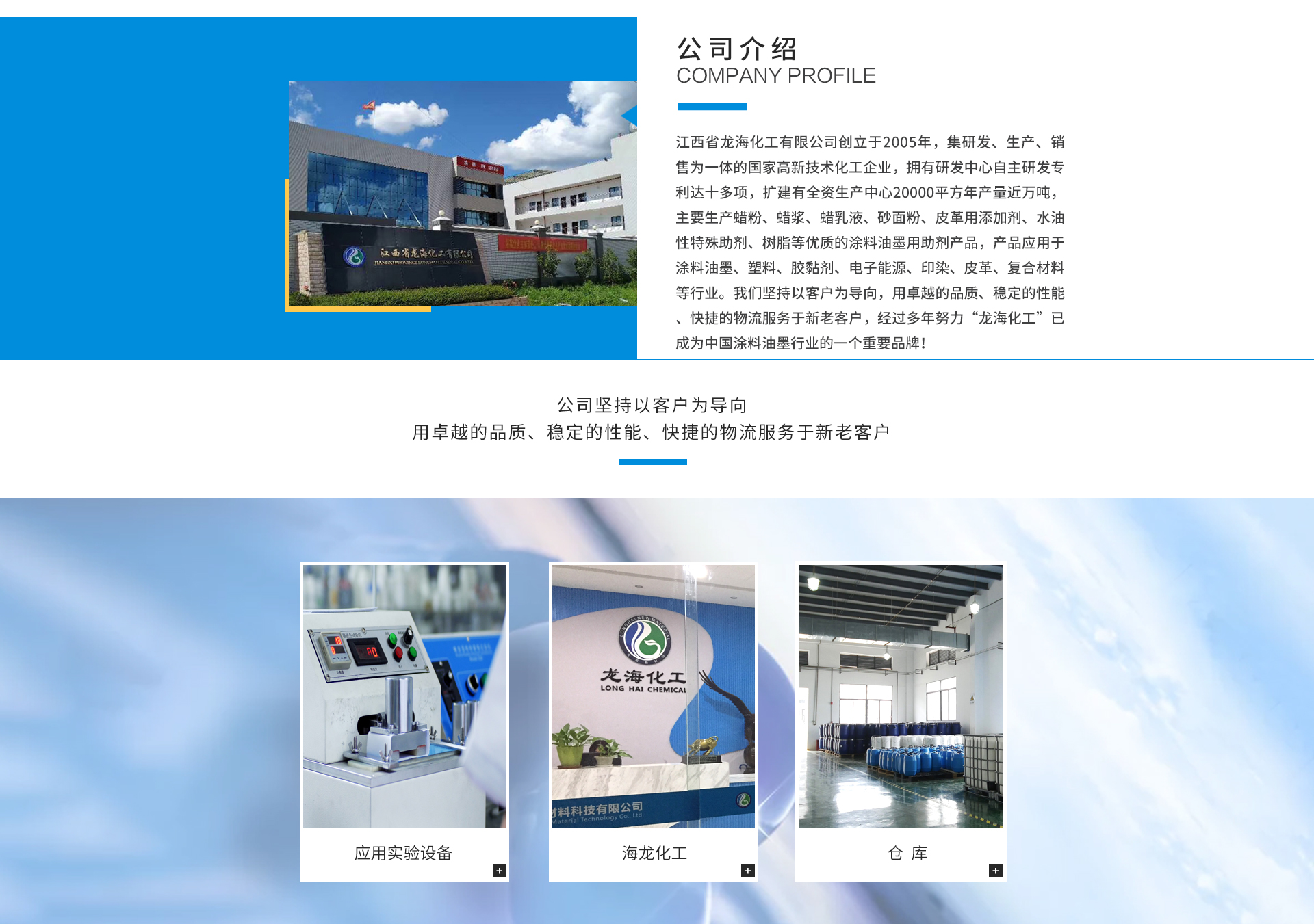 主营产品蜡浆,消光蜡浆,蜡粉,微粉蜡,蜡乳液,蜡助剂,高分子分散剂,水性银粉定向剂,防锈剂,水性助剂,水性聚酰胺防沉剂,防沉剂,聚乙烯蜡乳液,巴西棕榈蜡粉,巴西棕榈蜡浆,砂面粉,抗刮砂纹剂,耐磨蜡粉,消光蜡粉,费托蜡粉,聚丙烯蜡粉,聚四氟乙烯蜡粉,聚烯烃蜡乳液,聚酰胺蜡流变助剂,皮革手感蜡,涂料助剂,单宁酸阻聚剂,耐化学品助剂,水性耐盐雾助剂,水性附着力促进剂,水性烤漆密着增进剂,湿附着力促进剂,交联剂,多功能助剂,水性铝粉处理剂,水性PP处理剂,PTFE蜡粉蜡浆,邦定蜡,脱气蜡,高光蜡,油滑手感剂,爽滑剂,抛光蜡粉,哑粉分散剂,氧化聚乙烯蜡,增硬剂,低密度聚乙烯蜡,打磨蜡,水性润湿流平剂,水性流平剂,消泡剂,消泡润湿剂,非硅润湿剂,抗缩边流平剂,水性硅类消泡剂,水性非硅类消泡剂,增稠剂,聚氨酯增稠剂,银粉定向排列助剂,水性耐磨手感剂,水性抛光液,止滑蜡乳液,水性抗回粘助剂,高耐磨蜡分散体,油墨助剂,油墨消泡剂,触变剂,增硬耐磨剂,铝粉定向剂,多功能增硬手感剂,高分子蜡浆,高分子聚合物,颜料分散剂,表印油墨用蜡粉,地坪漆助剂,工业漆助剂,UV漆蜡助剂,木器漆蜡助剂,环保蜡助剂,弹性手感蜡粉,eva蜡,塑料色母粒蜡助剂,EAA蜡,石蜡乳液,水溶体系蜡助剂,改性硅溶液蜡助剂,抗滴落蜡助剂,PVC稳定剂用蜡,龙海蜡助剂,龙海化工,江西省龙海化工,江西省化工助剂,化工助剂,耐盐雾剂